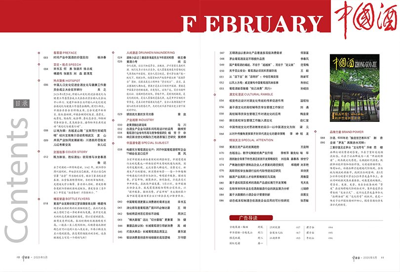 此外,该杂志还与中国著名的酒庄、酿酒师进行深入合作,开展专访和专题报道,为读者呈现更多的前沿视角和独一无二的观点。通过这些内容,读者可以全面了解中国酒的品牌、品种和品质,着眼于国内酒业的发展动向。作为中国酒文化的守护者,《中国酒》杂志秉承着推动中国酒事业发展的使命,力求提升读者对中国酒的认知和鉴赏水平。杂志还定期举办中国酒文化交流活动,为读者与酒业从业人员提供广阔的交流平台,促进行业企业的发展。